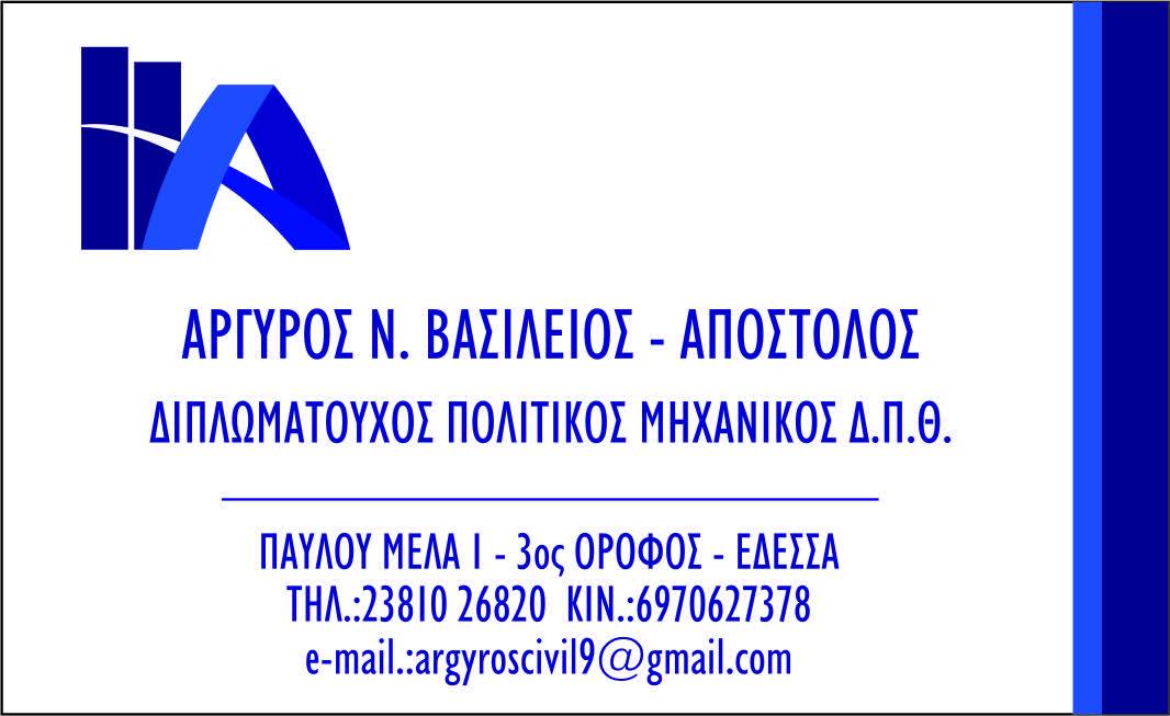 customer tabsΕπικοινωνίαΔιπλωματούχος Πολιτικός Μηχανικός Δ.Π.Θ.Τεχνικά Γραφεία και ΕταιρείεςΔόμηση - ΚατοικίαΠαύλου Μελά 1ΕΔΕΣΣΑ ΠΕΛΛΑΣΠΕΛΛΑΜΑΚΕΔΟΝΙΑ 2381026820 69706273782381026820argyroscivil9@gmail.comhttps://www.facebook.com/Τεχνικό-Γραφείο-Αργυρός-Ν.Βασίλειος-Απόστολος Το προτείνω (έχει προταθεί 5 φορές) ΦωτογραφίεςFacebook LikeShare on FacebookTweet Widget
